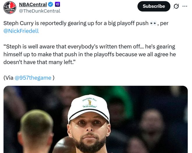 勇士记者Nick Friedell也在湾区电台节目中公开表示:“库里深知大家都已经将他们排除在外,但他正在全力以赴,准备在季后赛中奋力一搏,因为所有人都知道留给他的机会不多了。”